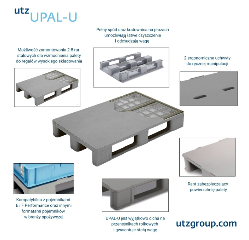 Palety plastikowe Utz charakteryzują się stałą masą własną, odpornością na wilgoć, chemikalia i uszkodzenia mechaniczne. Są łatwe w czyszczeniu, co ma kluczowe znaczenie w branżach wymagających wysokiej higieny. Model UPAL-U wykonany jest z wysokiej jakości tworzywa UIC® (regranulat), co zapewnia odporność na wilgoć, chemikalia i zmienne warunki temperaturowe. Nośność statyczna palety wynosi do 5000 kg, a dynamiczna do 1500 kg, co pozwala na bezpieczne składowanie i transport
